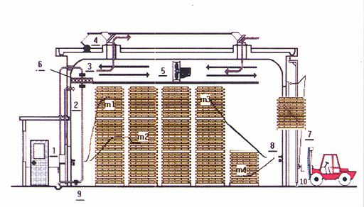 干燥窯是以蒸汽為熱源,濕空氣為介質,通過控制干燥介質的參數科學的對木材進行干燥處理。采用蒸汽加熱可實現的窯內溫、濕度控制從而獲得干燥質量好、含水率均勻的木材干燥產品。