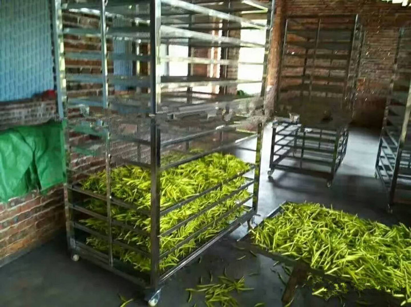 烘干工藝第三步:將高溫蒸煮后的黃花菜均勻鋪放到物料車內,注意厚度均勻,每層不超過3CM。